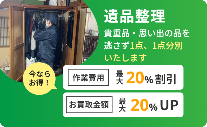 | 遺品の買取 | 家具や家電、その他貴重品などでまだ利用できるものは買取させていただき、作業費用から割引いたします。 買取物が作業費用を超える場合はこちらからお支払いいたします。 |