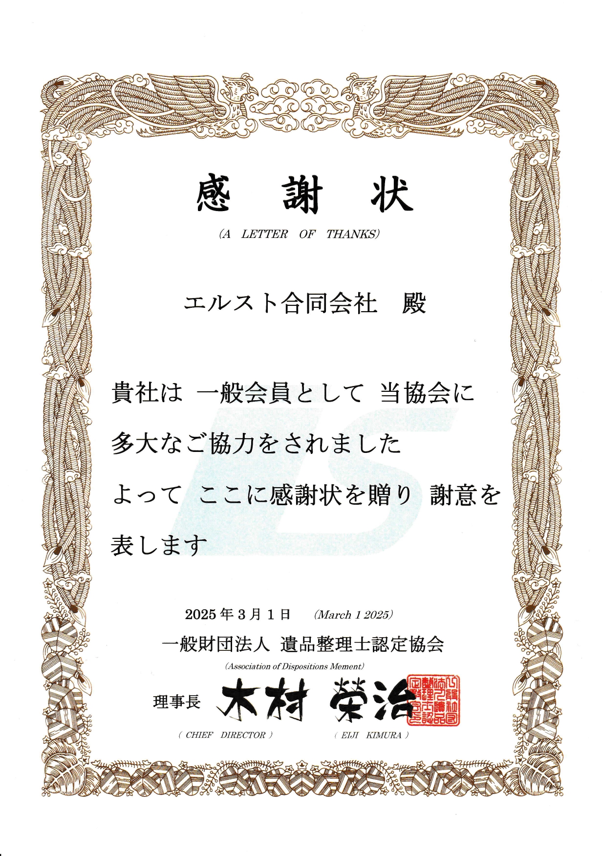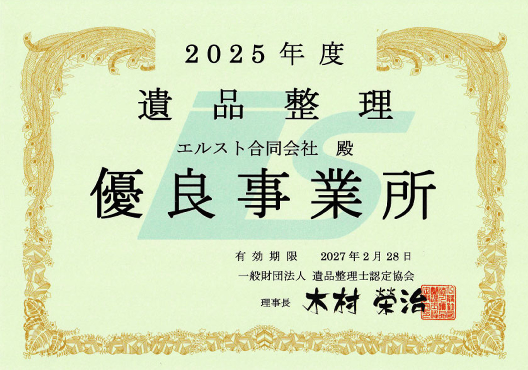 クリーンサービスは、遺品整理士認定協会が認定する「優良事業所」に認定されている企業です。